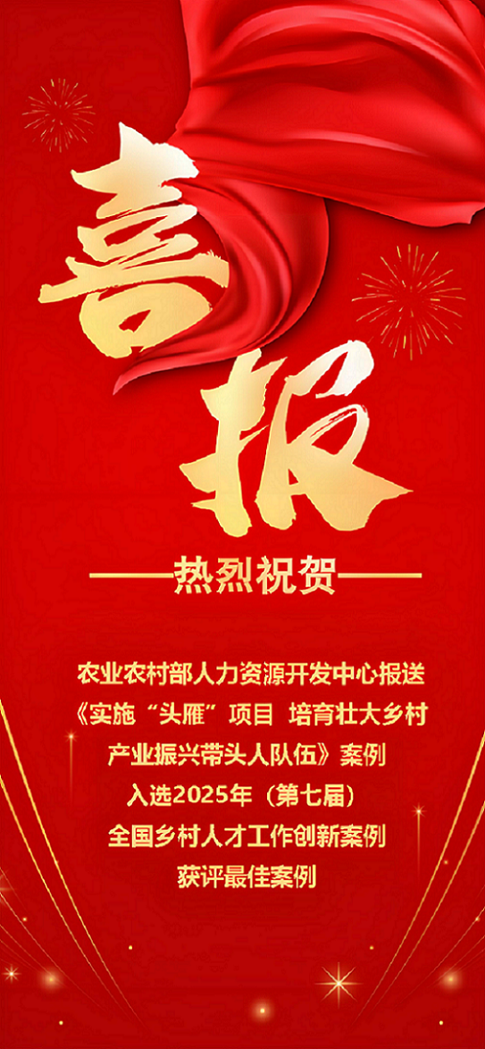 10月14日,中国人才杂志社揭晓2025年(第七届)全国人才工作创新案例征集评选活动结果,农业农村部人力资源开发中心报送的《实施“头雁”项目 培育壮大乡村产业振兴带头人队伍》案例,在全国1200余篇案例中脱颖而出,成功入选50篇最佳案例。